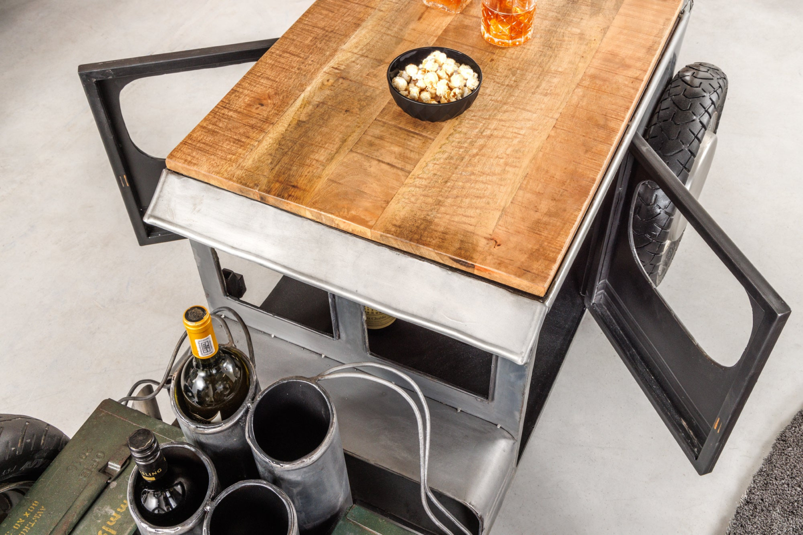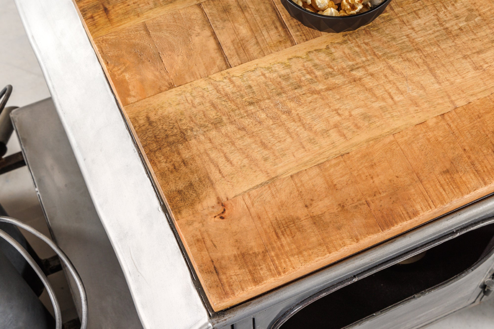 Mușa de cafea este fabricată din materiale de înaltă calitate. Blatul din lemn de mango este robust și durabil, în timp ce tabla de oțel îi conferă un aspect unic. Blocul motor al măsuței de cafea are un suport pentru șase sticle, astfel încât să ai întotdeauna băuturile preferate la îndemână. O piesă unică realizată din materiale reciclate, această piesă de mobilier îți permite să contribui la protejarea mediului.