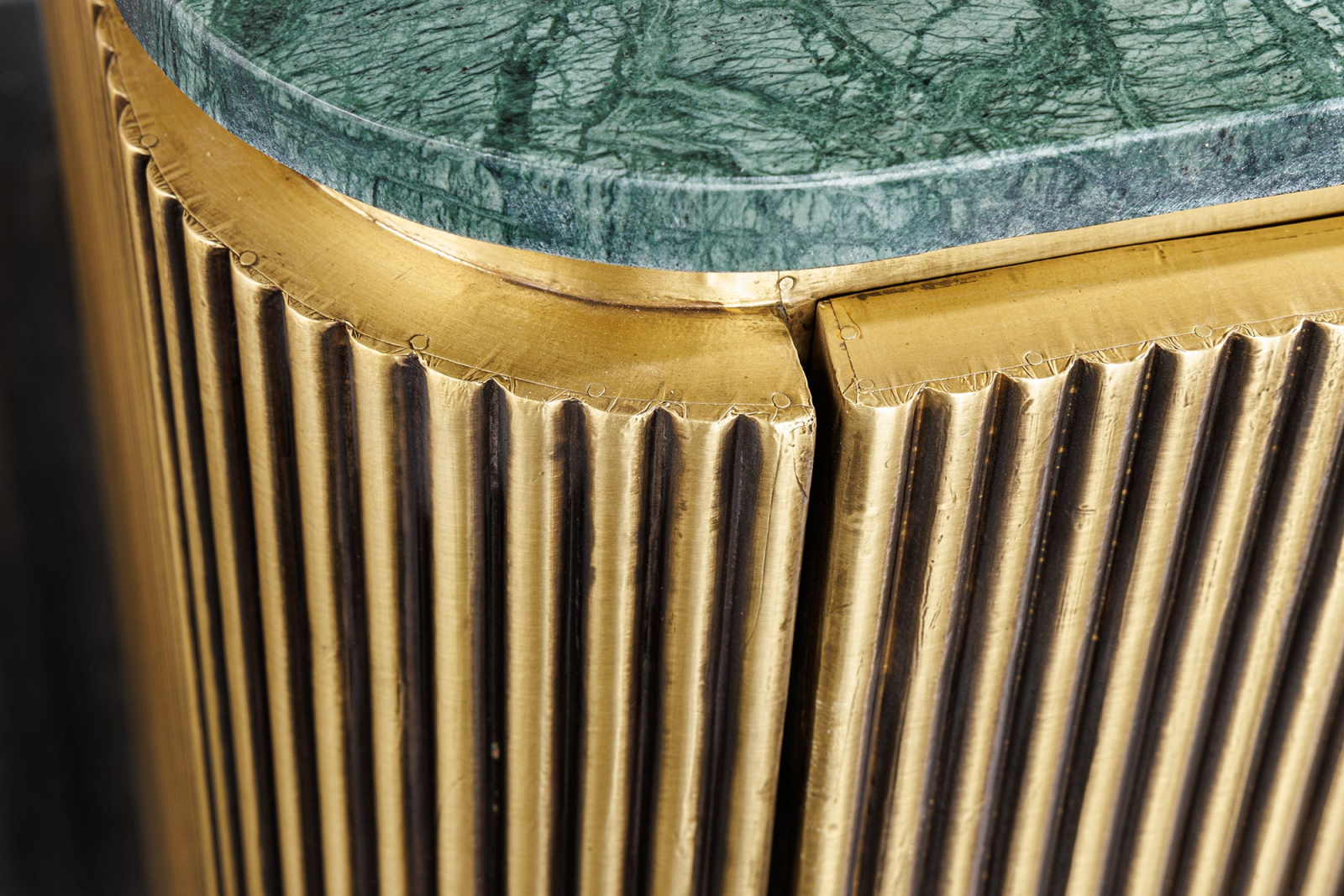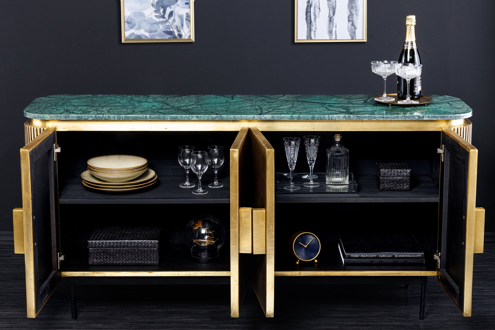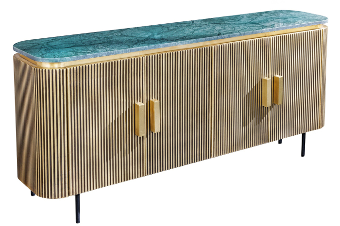 Acest bufet solid, realizat din lemn de mango de înaltă calitate, cu finisaj din alamă, se mândrește cu un design unic al suprafeței. Blatul din marmură verde, marginile rotunjite și cadrul metalic negru se combină pentru a crea un aspect retro captivant. Designul cu nervuri și finisajul în culoarea alamei sunt caracteristici tipice stilului Art Deco și conferă casei dvs. o ambianță plină de farmec.
