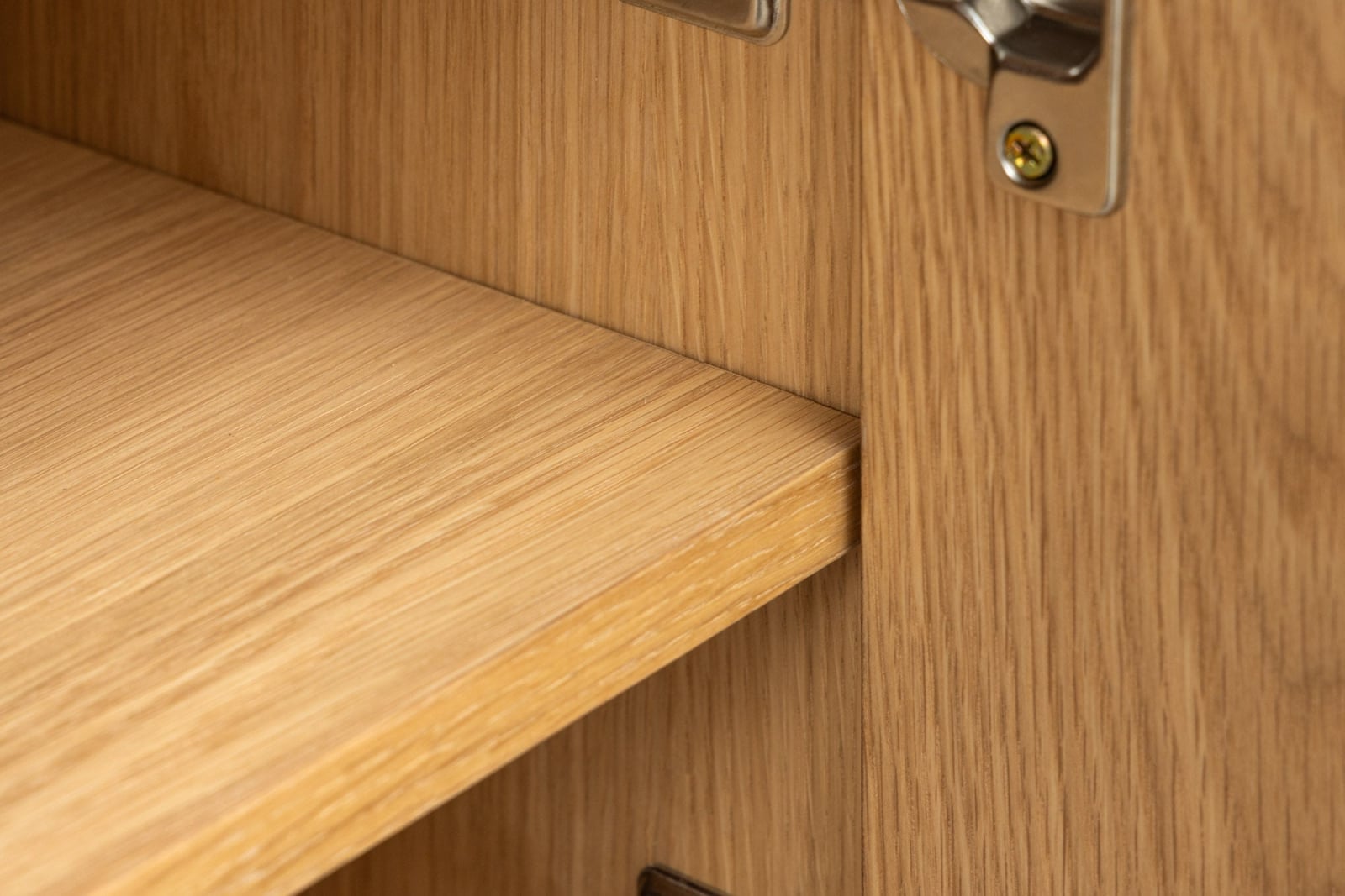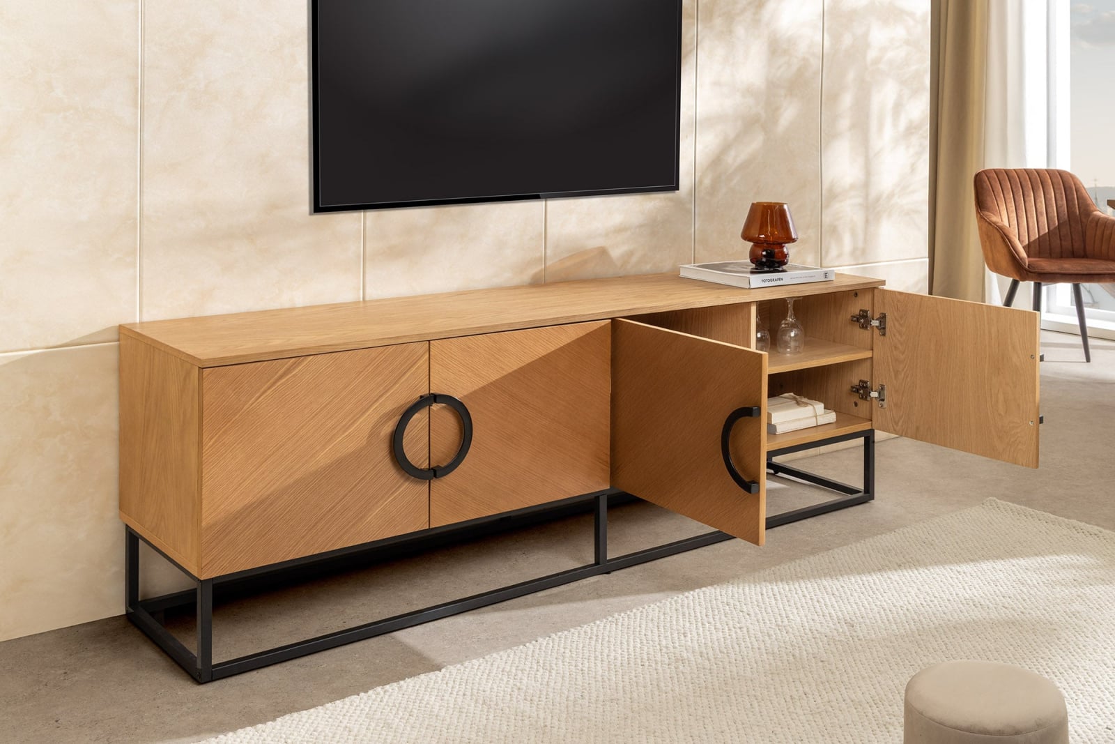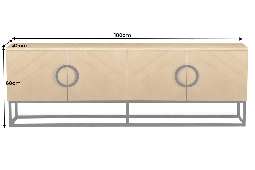 Comoda joasă GRANDEZZA aduce o notă elegantă în spațiul dvs. de locuit. Aspectul cald al corpului, finisat cu furnir de stejar natural de înaltă calitate, aduce eleganță naturală casei dvs. Rama metalică neagră impresionantă și mânerele circulare creează un contrast interesant și subliniază caracterul modern al piesei.