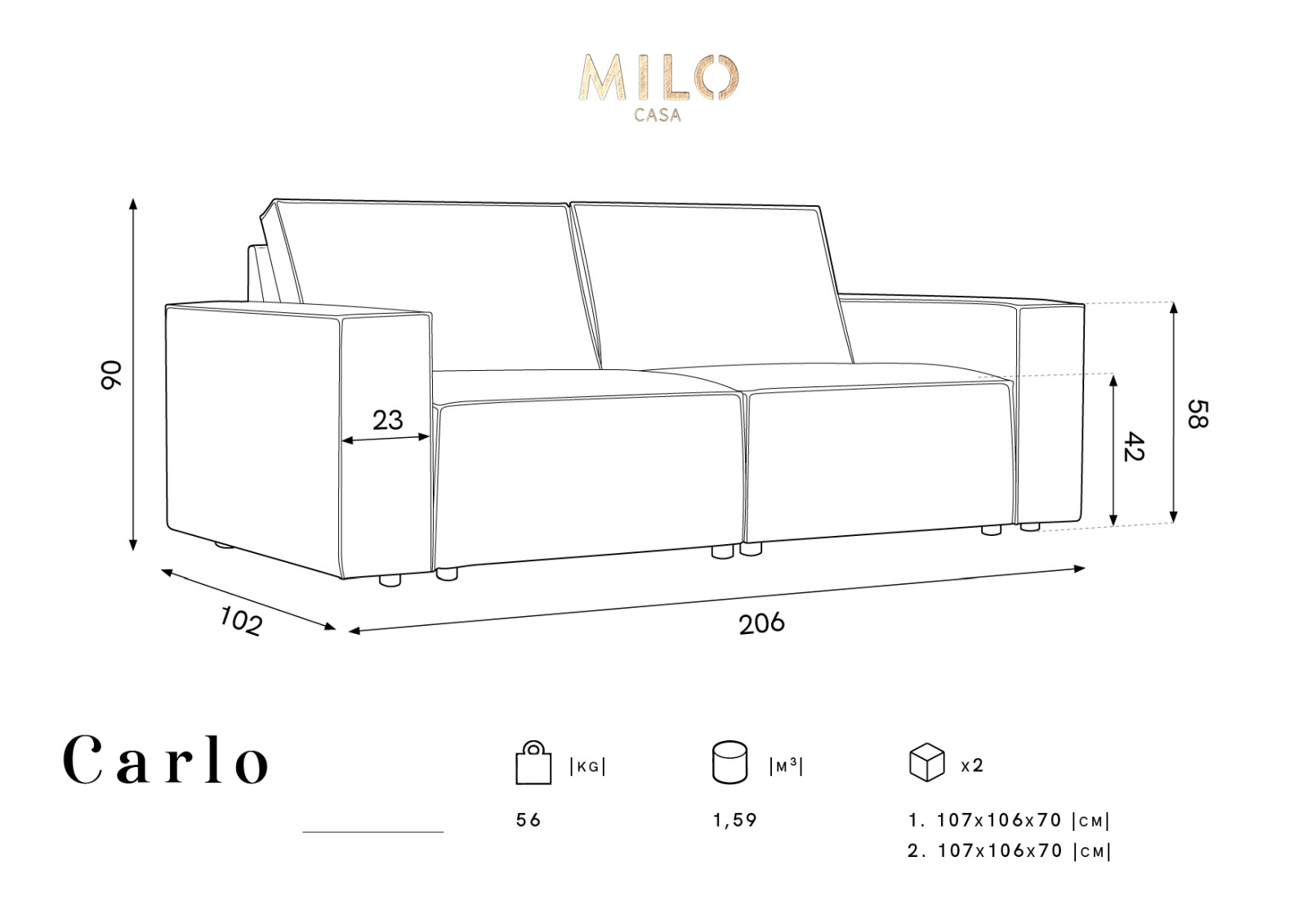 lungime 206 cm/lățime 102 cm/inălțime 90 cm