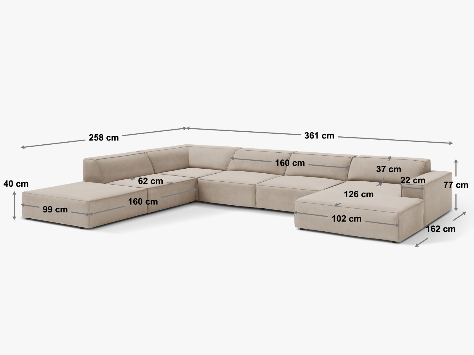 Lungime 361 cm/lățime 258 cm/înălțime 77 cm