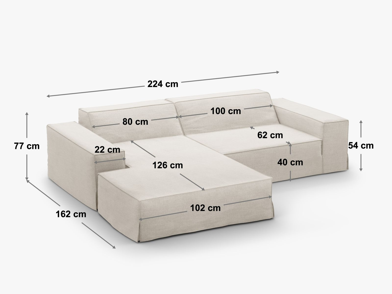 Lungime 224 cm/lățime 162 cm/înălțime 77 cm