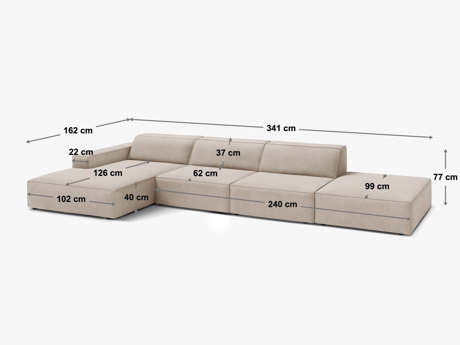 Lungime 341 cm/lățime 162 cm/înălțime 77 cm