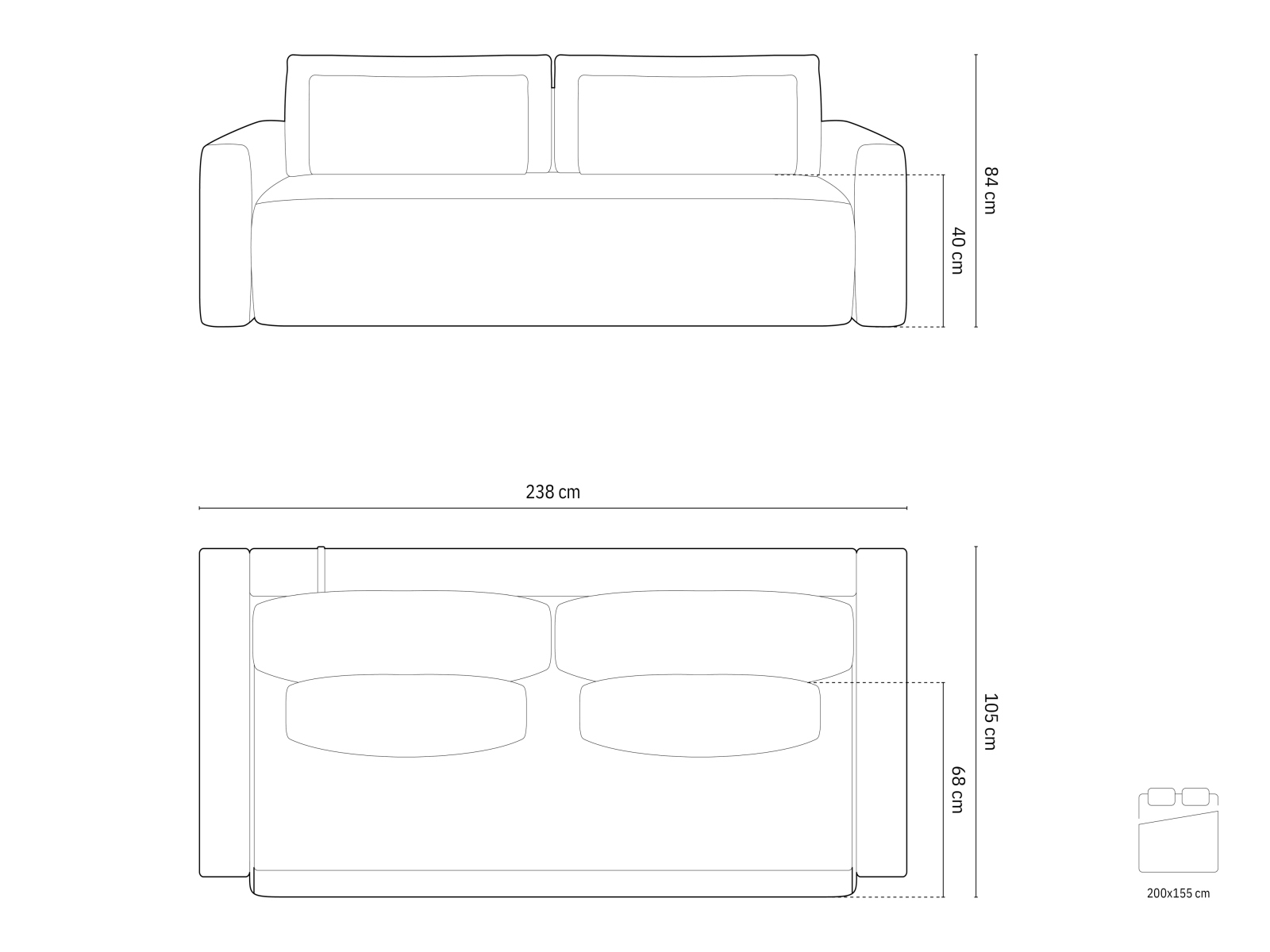 lungime 238 cm/lățime 105 cm/inălțime 84 cm