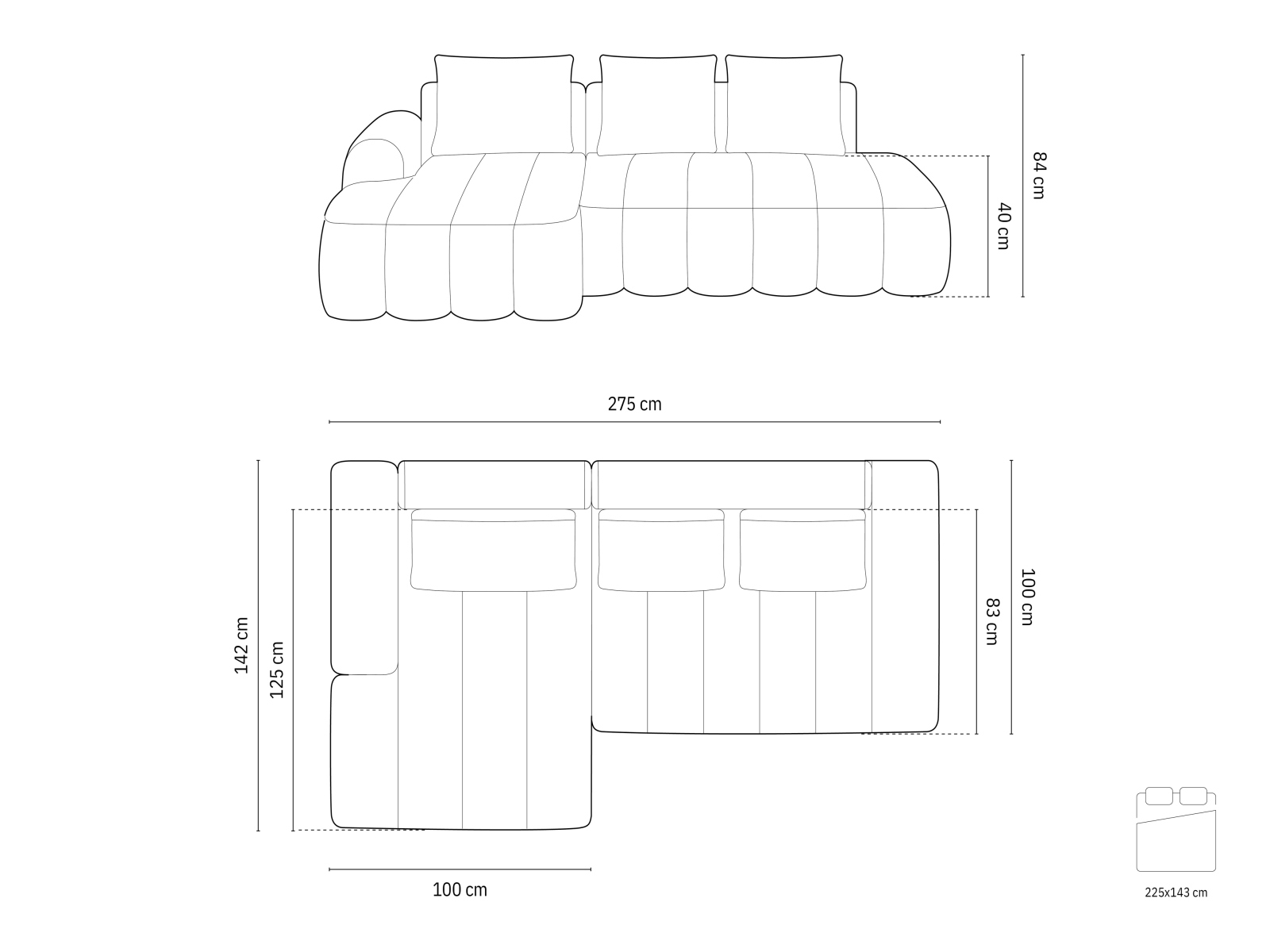 lungime 275 cm/lățime 142 cm/inălțime 84 cm