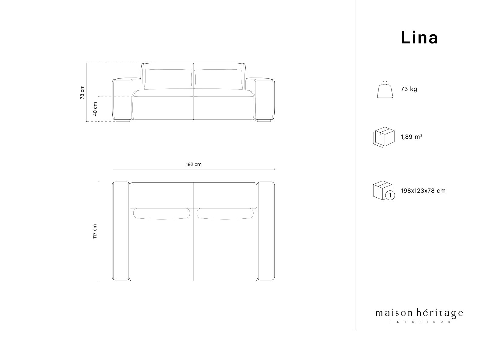 Catifea de cea mai buna calitate cu o suprafata foarte neteda. Extrem de moale la atingere. Calitatea inalta a materialului combinata cu un aspect elegant si foarte placut face ca materialul de pe canapeaua Lina sa arate impecabil. Suprafața cu un luciu catifelat și menținută într-o estetică subtilă conferă un efect vizual foarte interesant în funcție de dispunerea materialului și de unghiul de incidență al luminii. Datorită tehnologiei Cleanaboo, absorbția lichidelor este limitată, iar lichidul curge pe suprafața sa. Țesătura este și rezistentă la puf, motiv pentru care este recomandată proprietarilor de animale de companie (tehnologia Petproof) și foarte rezistentă la abraziune, ceea ce conferă mobilierului un aspect estetic pentru o lungă perioadă de timp (test Martindale: 60.000, 300 g/m², compoziție: 100% poliester). Siguranța pentru utilizator și absența substanțelor nocive este confirmată de certificatul OEKO-TEX ® STANDARD 100.