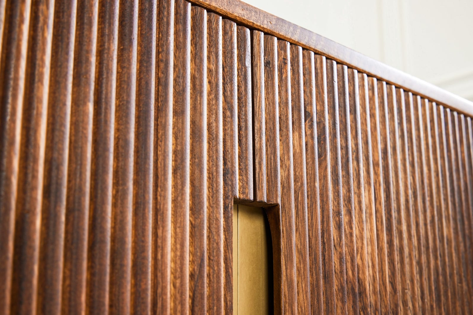Comoda TV GATSBY aduce o piesă de mobilier extraordinară în casa ta. Ușile mari din față și cadrul sunt realizate din lemn masiv de mango. Lemnul de mango captivează prin variațiile sale de culoare izbitoare și textura unică. Laturile rotunjite, suprafața canelată a lemnului și cadrul metalic auriu mat creează amestecul perfect între stilul modern și flerul retro.