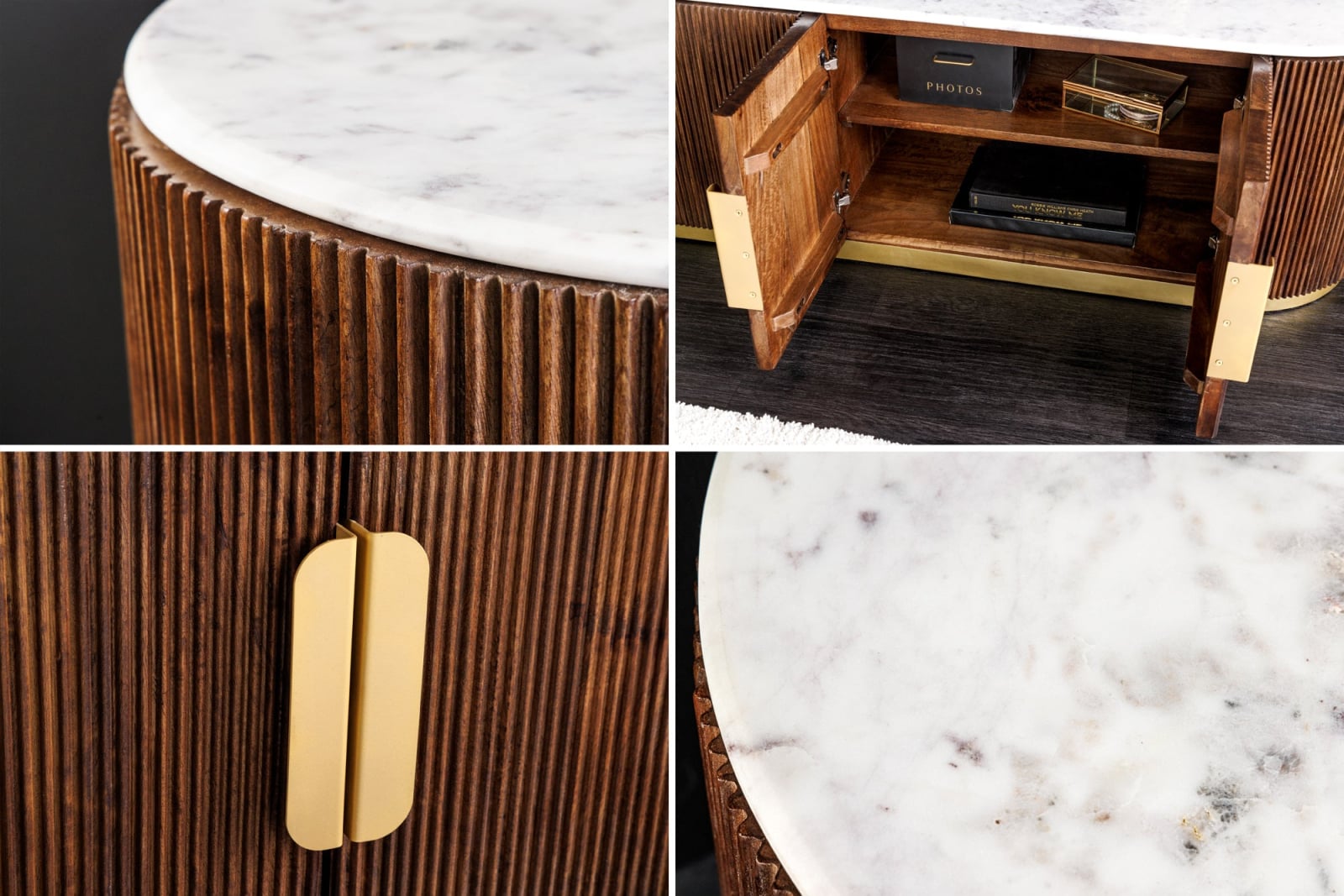 Căutați o piesă de mobilier elegantă, cu caracter? Suportul TV GATSBY combină materiale luxoase cu un design elegant. Rama din lemn de mango lăcuit maro emană căldură și frumusețe naturală, în timp ce forma rotunjită creează un aspect moale și armonios. Mânerele și ornamentele metalice aurii adaugă accente sofisticate și conferă suportului o notă de strălucire. Un punct culminant special este blatul din marmură albă lustruită, care completează perfect designul - se sprijină pur și simplu pe partea superioară și poate fi înlocuit cu ușurință.