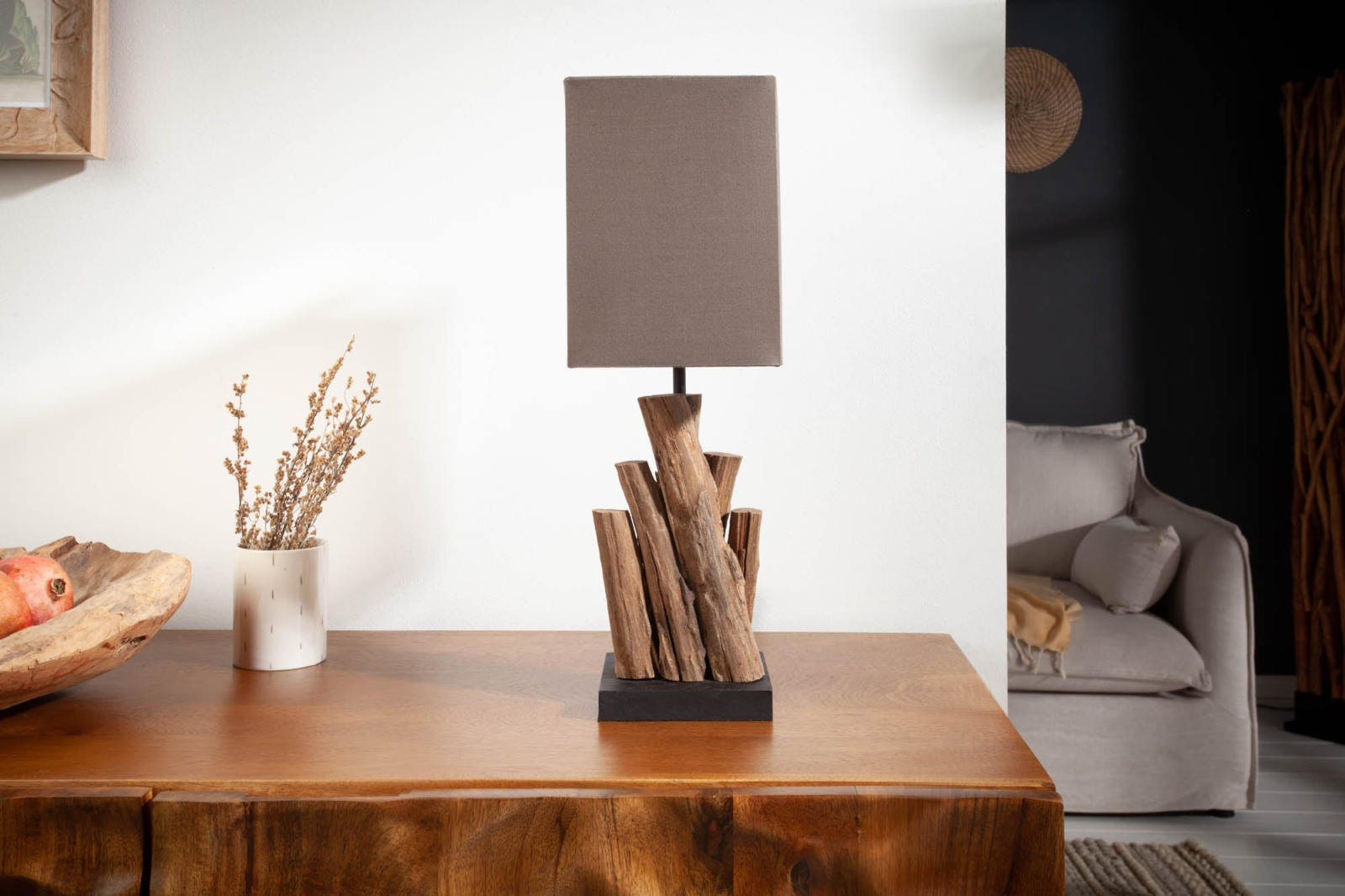 Lampă de masă PURE NATURE 45cml, din lemn reciclat cu abajur din bumbac maro