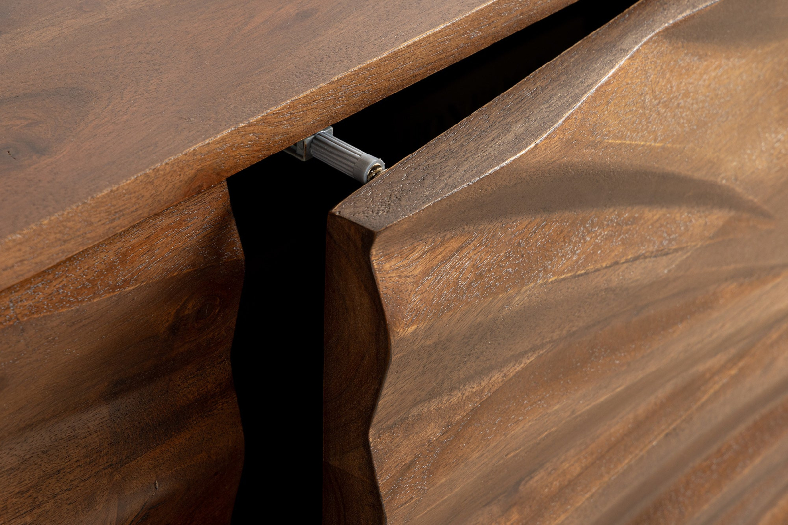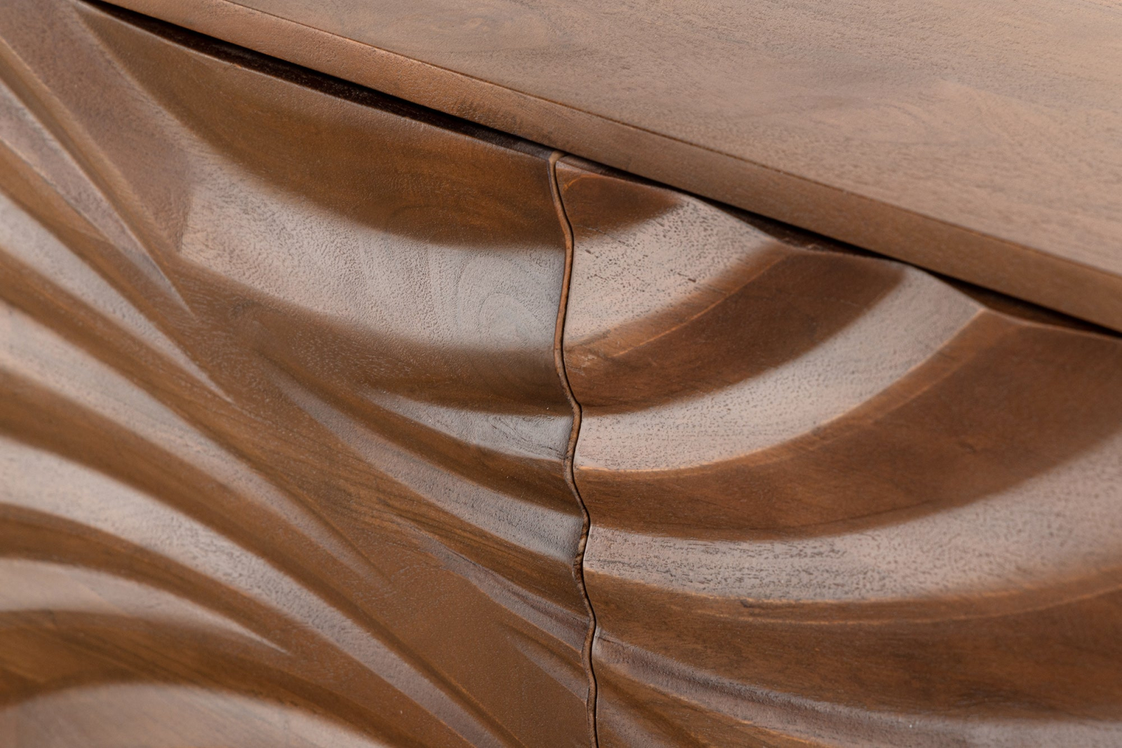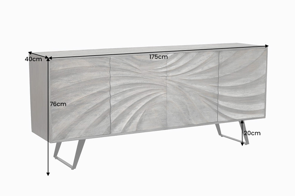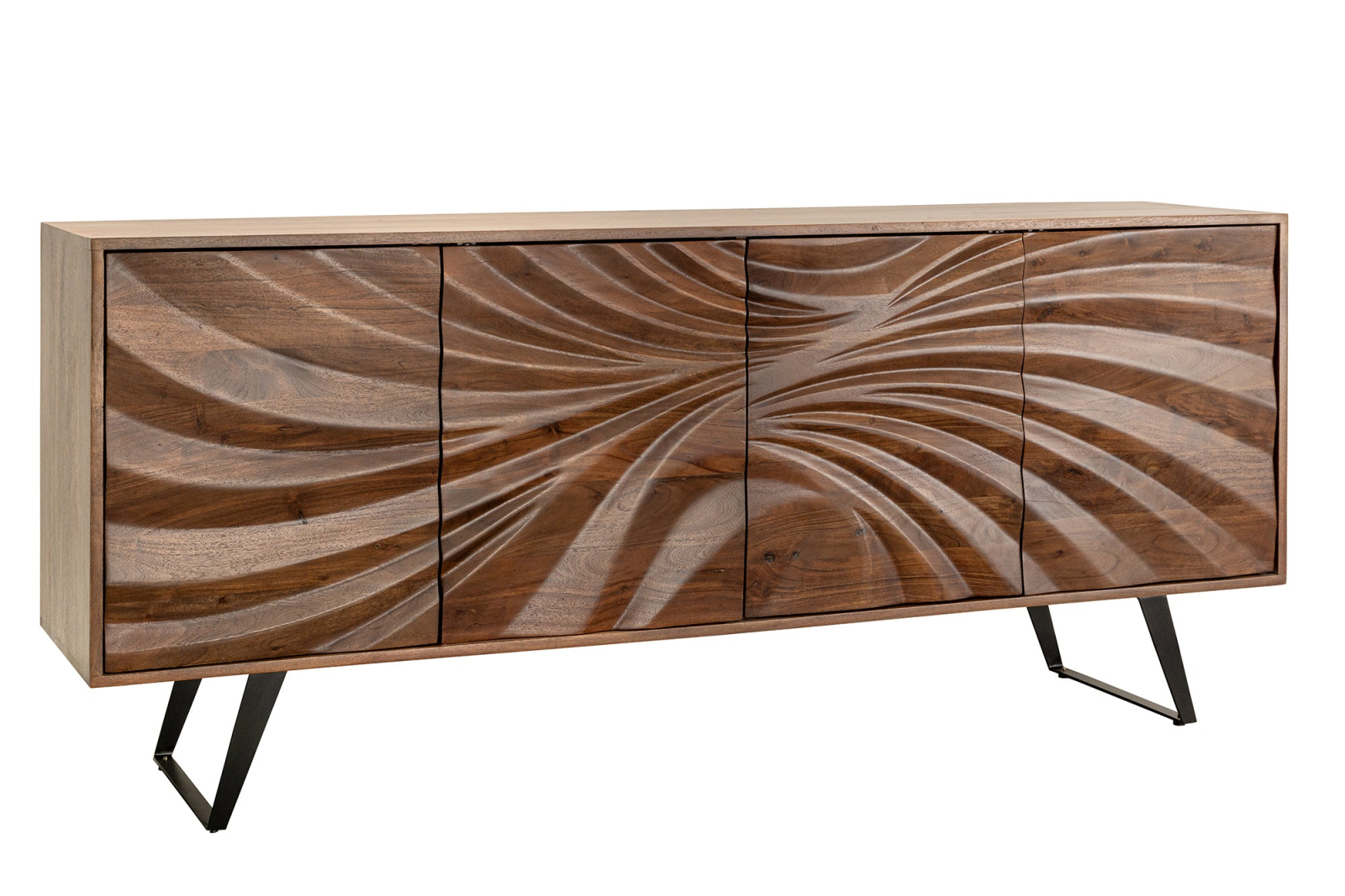 Îți place designul extravagant și ai nevoie de spațiu suplimentar de depozitare în casa ta? Atunci bufetul nostru de design HURRICANE este alegerea ideală! Punctul culminant al acestui bufet din lemn masiv este, fără îndoială, sculptura 3D artistică de pe față. Contururile ample par să plutească pe suprafață, captivând prin aspectul lor extraordinar. Datorită cadrului metalic solid cu vopsea neagră în câmp electrostatic, dulapul stă ferm. Fibra unică a lemnului face din acest bufet o piesă cu adevărat unică pentru casa ta. Experimentează bufetul modern HURRICANE în propriul tău spațiu!