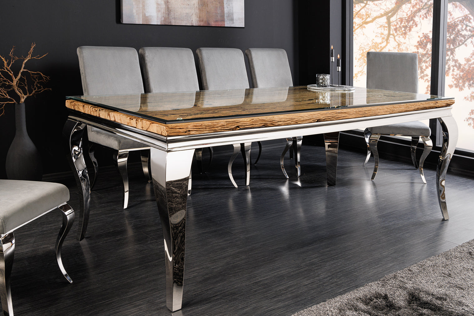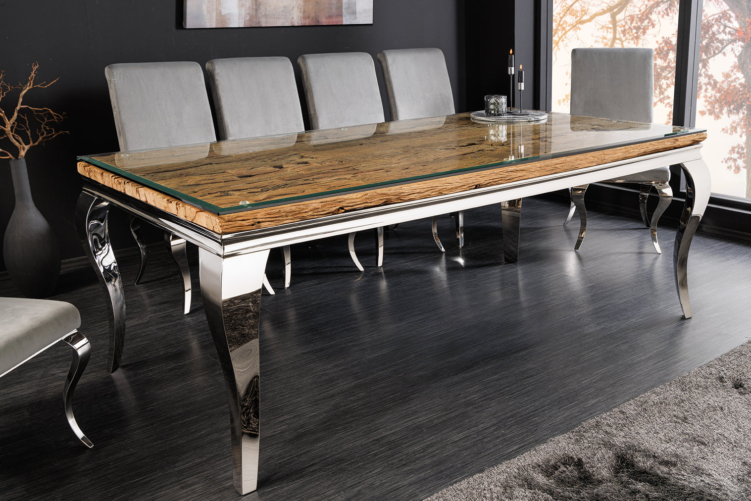 Masă de dining MODERN BAROCK BARRACUDA 200cm cromată cu blat din sticlă securizata si lemn masiv de tec