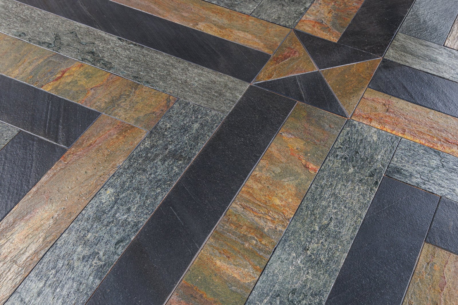 Furnir de piatră cu aspect elegant de scândură, cu variații de culoare de la negru la gri