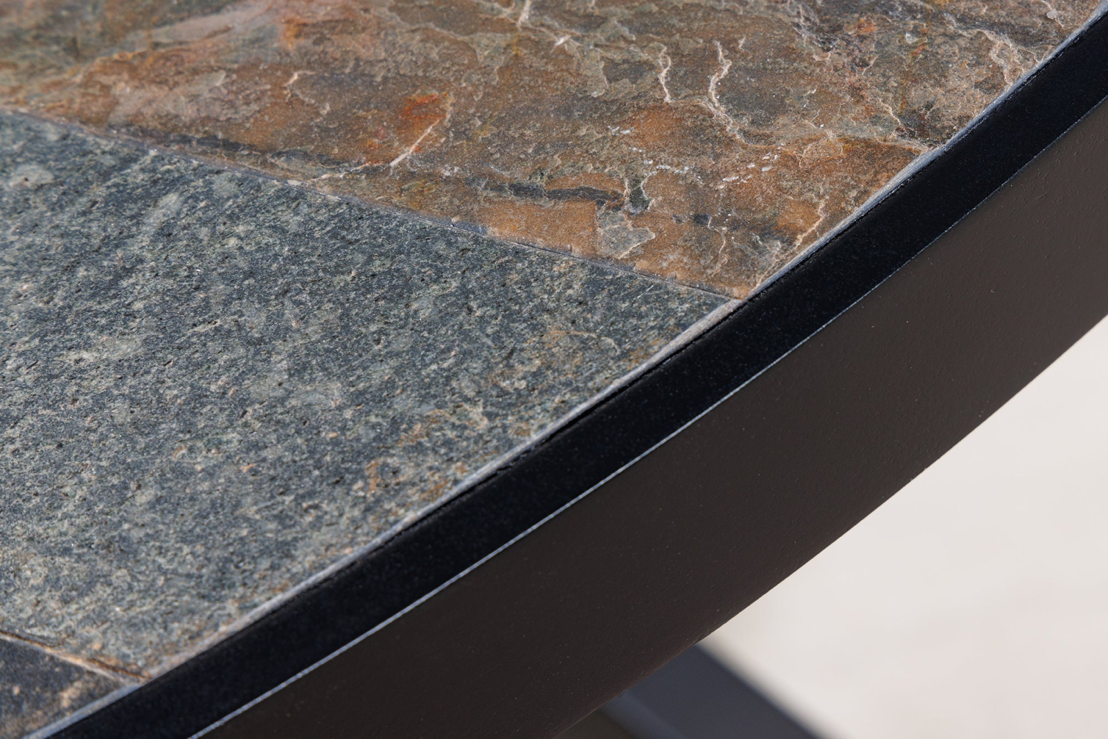 Aduceți o notă de confort pur în casa dvs. cu masa rotundă MOUNTAIN SOUL. Această masă combină materiale de înaltă calitate cu un design unic care vă îmbogățește zona de luat masa cu farmec și stil. Blatul rotund, realizat din furnir de piatră naturală autentică, se mândrește cu un aspect atractiv de scândură, cu diverse nuanțe de negru, gri și lemn natural, creând un joc armonios de culori. Blatul este susținut de o bază robustă din fier negru, ale cărei linii curate adaugă o notă modernă, industrială.