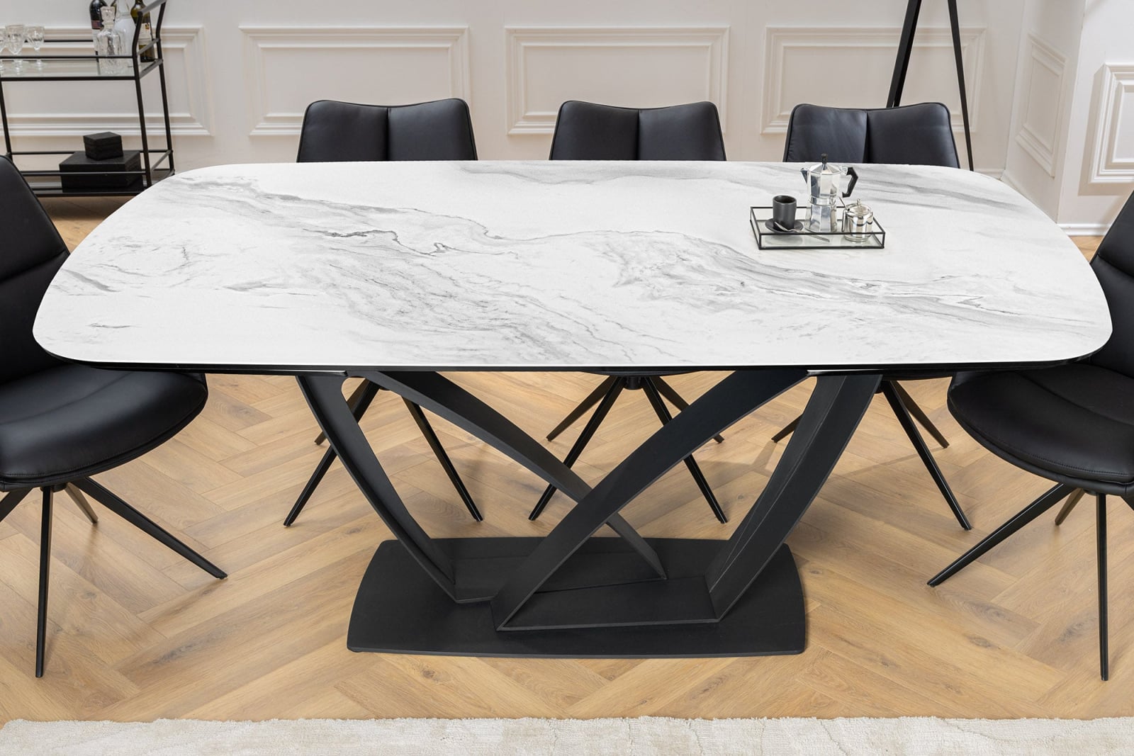 Masă extensibilă modernă cu design din marmură albă și bază din metal negru pentru întâlniri mari