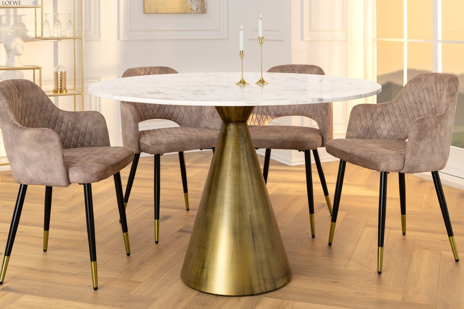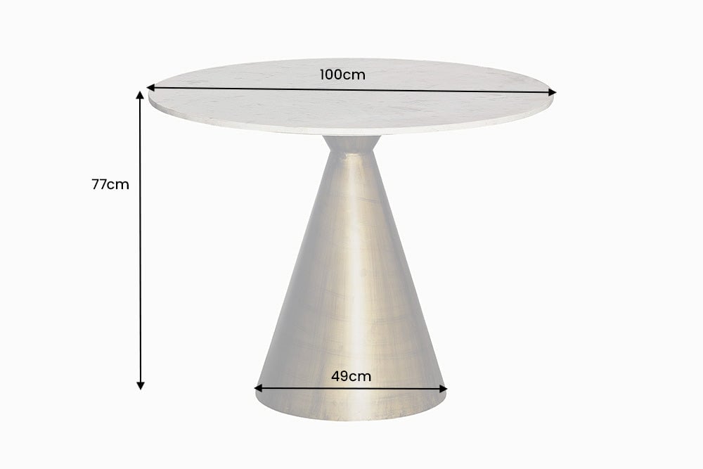Grafica naturală a blatului de marmură lucrat manual face ca fiecare masă să fie unică și adaugă o notă de lux spațiului dvs. de locuit. Baza robustă din alamă-auriu accentuează aspectul elegant și asigură stabilitate și un aspect armonios. Cu un diametru de 100 cm, masa ELEGANCIA oferă spațiu amplu pentru cine confortabile sau întâlniri relaxante la cafea. Datorită designului său atemporal, masa completează o varietate de stiluri interioare: asortați-o cu scaune din catifea pentru o ambianță sofisticată, cu scaune minimaliste pentru un aspect modern sau cu accente calde din lemn pentru o atmosferă primitoare. Fie că este în sufragerie, bucătărie sau living, masa ELEGANCIA este o declarație elegantă oriunde este amplasată. Adăugați o notă de eleganță sufrageriei dvs. și bucurați-vă de amestecul perfect de rafinament, măiestrie și funcționalitate. Masa rotundă ELEGANCIA aduce frumusețe atemporală și o ambianță exclusivă casei dvs.!