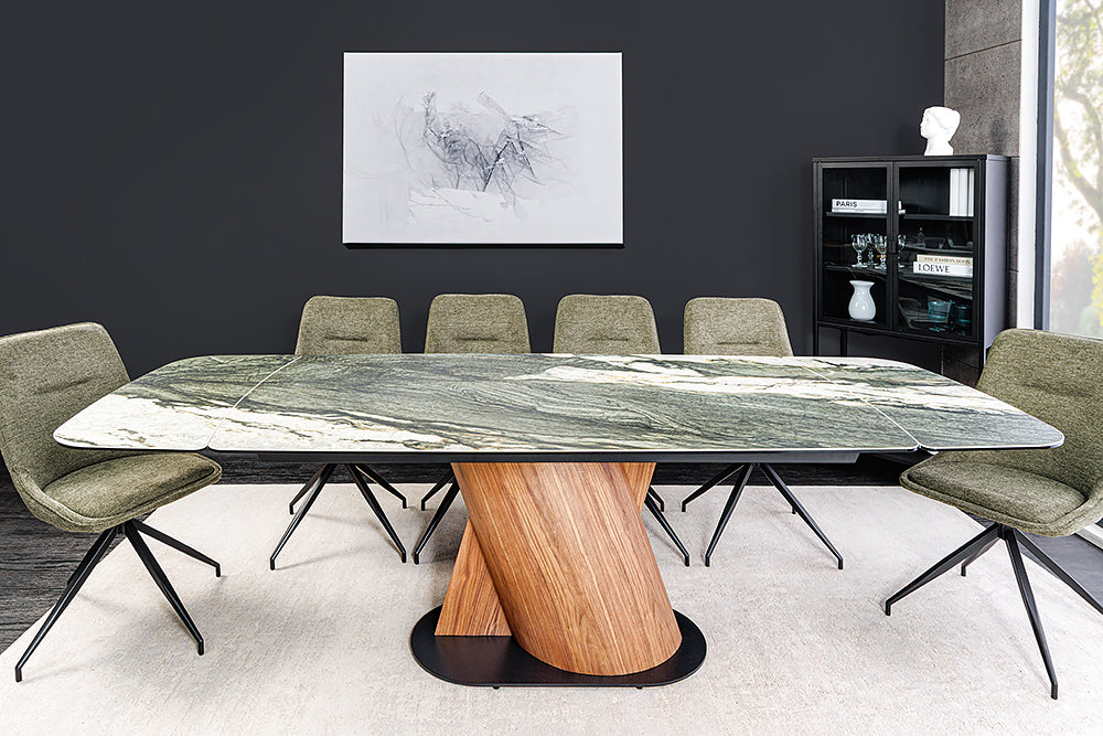 Fie că este vorba de mese confortabile în familie sau de seri festive cu prietenii, mecanismul practic de extensie permite extinderea mesei în cel mai scurt timp, oferind spațiu amplu pentru oaspeți suplimentari. Combinația de ceramică spaniolă robustă și furnir de nuc de înaltă calitate face din masa de dining ELEMENTS un companion elegant și de lungă durată. Designul său rafinat îmbină funcționalitatea cu sofisticarea modernă – o masă care adaugă caracter oricărei camere. Sfatul nostru: Combinați-o cu scaune tapițate în tonuri calde de pământ sau negru elegant pentru a crea un aspect general armonios și primitor.