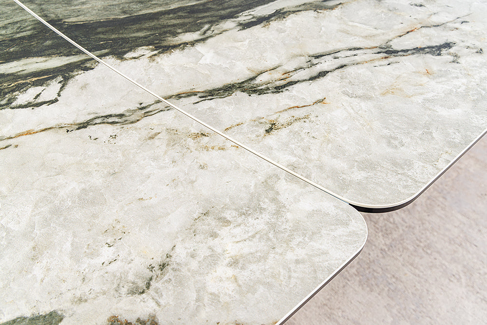 Masa extensibilă ELEMENTS combină eleganța naturală cu funcționalitatea superioară și măiestria rafinată. Blatul, realizat din ceramică spaniolă de înaltă calitate, într-o nuanță elegantă de gri-taupe, se mândrește cu un design sofisticat din marmură și conferă zonei dvs. de dining o ambianță luxoasă și modernă. Suprafața netedă nu este doar atrăgătoare din punct de vedere vizual, ci și excepțional de durabilă, ușor de curățat și rezistentă la căldură. Rama distinctivă, cu furnirul său elegant de nuc, adaugă o notă de căldură și creează un contrast armonios cu eleganța relaxată a blatului ceramic.