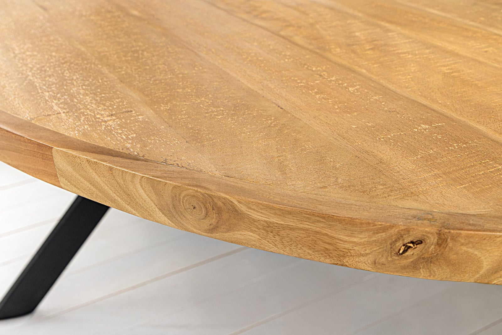 Masa de sufragerie GALAXIE impresionează prin designul său unic și materialele de înaltă calitate. Blatul oval mare, din lemn de mango maro, conferă mesei o senzație caldă și naturală, în timp ce baza în formă de stea din fier negru, impresionantă, creează un aspect modern, industrial.
