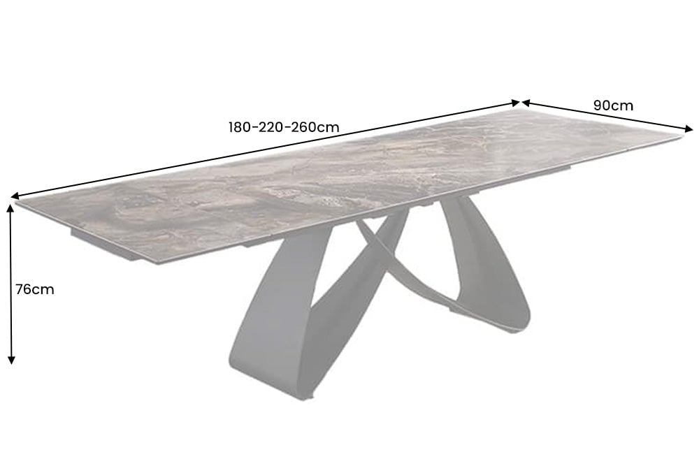 Descoperiți masa exclusivă INFINITY – noua și eleganta masă de sufragerie de design, cu blat extensibil din marmură-ceramică de înaltă calitate, în culoarea taupe. Această masă elegantă poate fi extinsă de la 180 cm la impresionantul 260 cm în cel mai scurt timp, putând găzdui confortabil până la 10 persoane. Perfectă pentru sufrageria modernă sau pentru zonele de living spațioase. Blatul combină aspectul luxos al marmurei cu proprietățile robuste ale ceramicii. Datorită suprafeței sale rezistente la zgârieturi, căldură și pete, masa dumneavoastră rămâne impecabilă chiar și în cazul utilizării zilnice. Venaturile fine, gri, conferă camerei dumneavoastră o ambianță sofisticată și modernă.