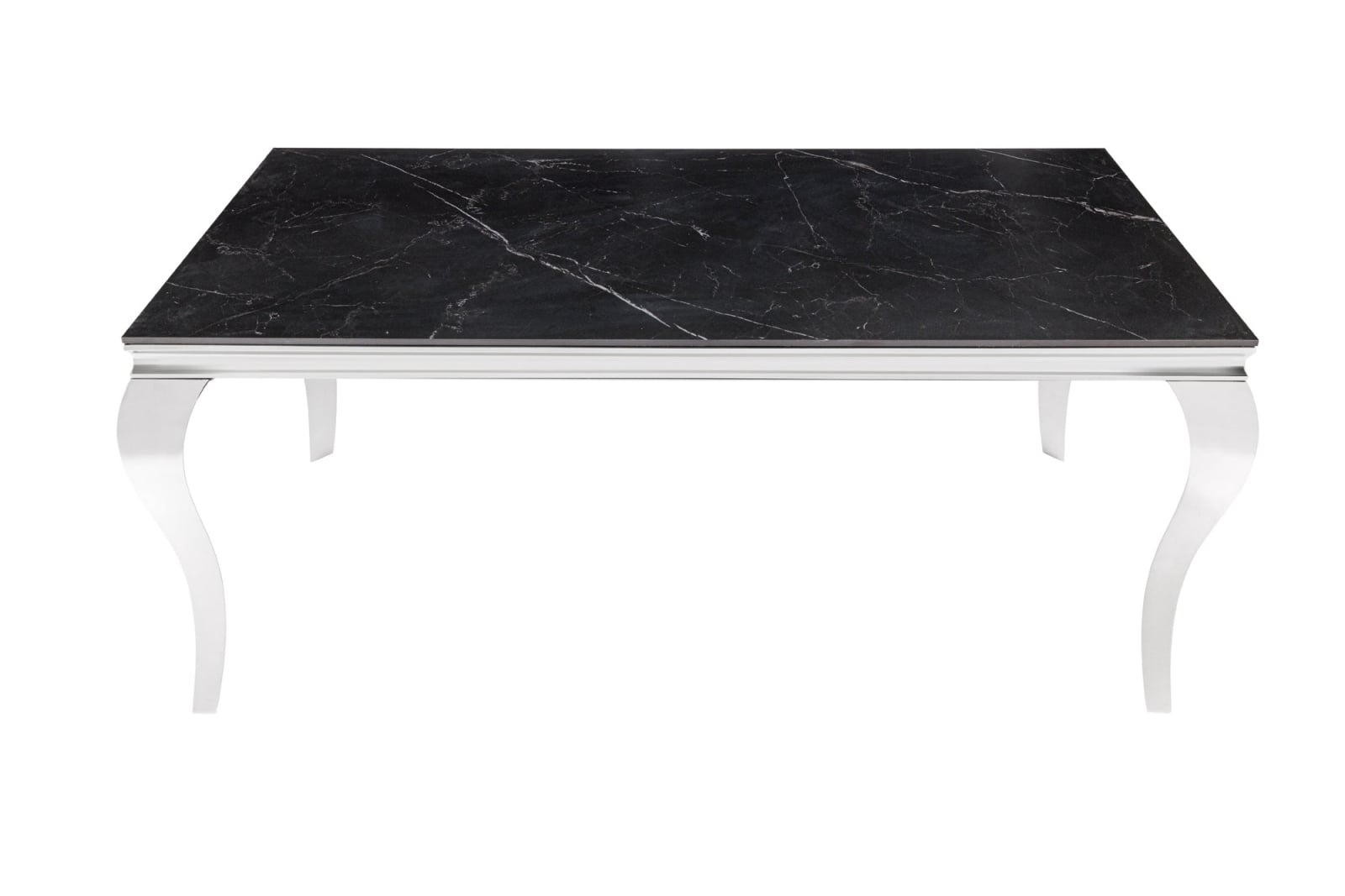 Baza din oțel inoxidabil de culoare cromată asigură stabilitate și un contrast strălucitor cu blatul negru al mesei. Combinația de oțel inoxidabil robust conferă mesei un aspect luxos și asigură că va rămâne în stare impecabilă mulți ani de acum înainte. Picioarele baroce curbate adaugă o notă rafinată și creează o combinație armonioasă de design clasic și modern. Masa de dining MODERN BAROCK este o operă de artă care vă va îmbunătăți zona de luat masa, transformând-o într-un loc de întâlnire și delectare. Invitați-vă familia și prietenii să se adune în jurul acestei mese magnifice și să savureze momente de neuitat într-un cadru elegant. Descoperiți frumusețea și calitatea mesei de dining MODERN BAROCK din lemn masiv și aduceți o notă de lux în casa dumneavoastră.