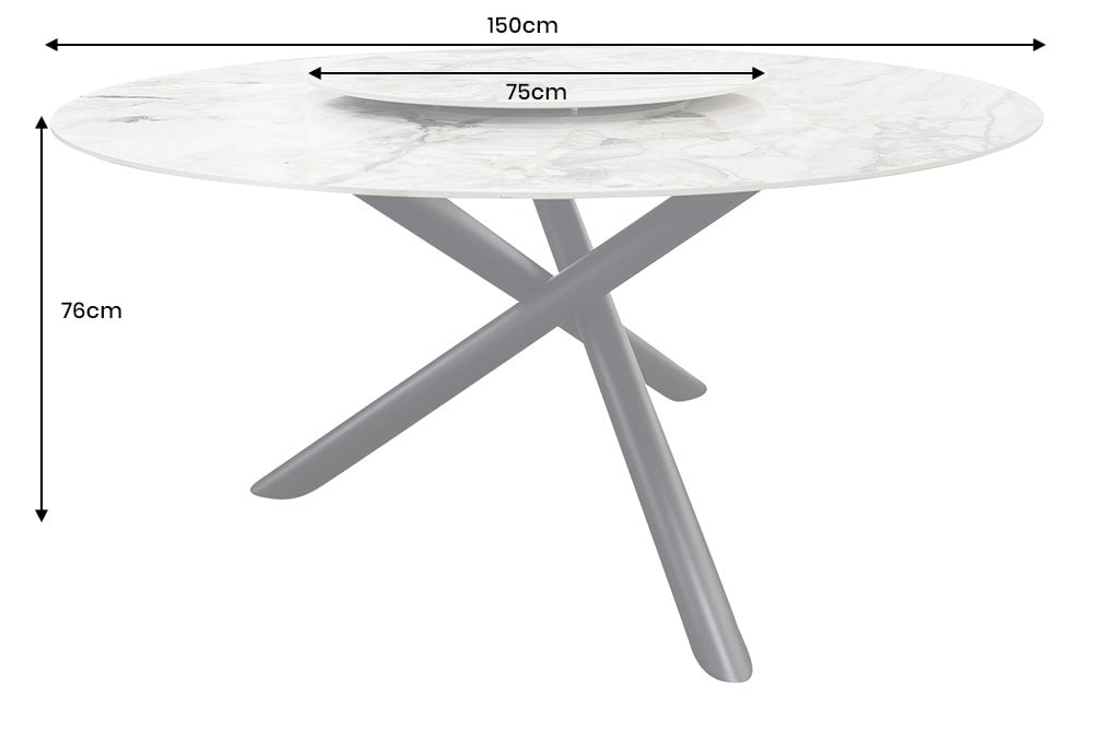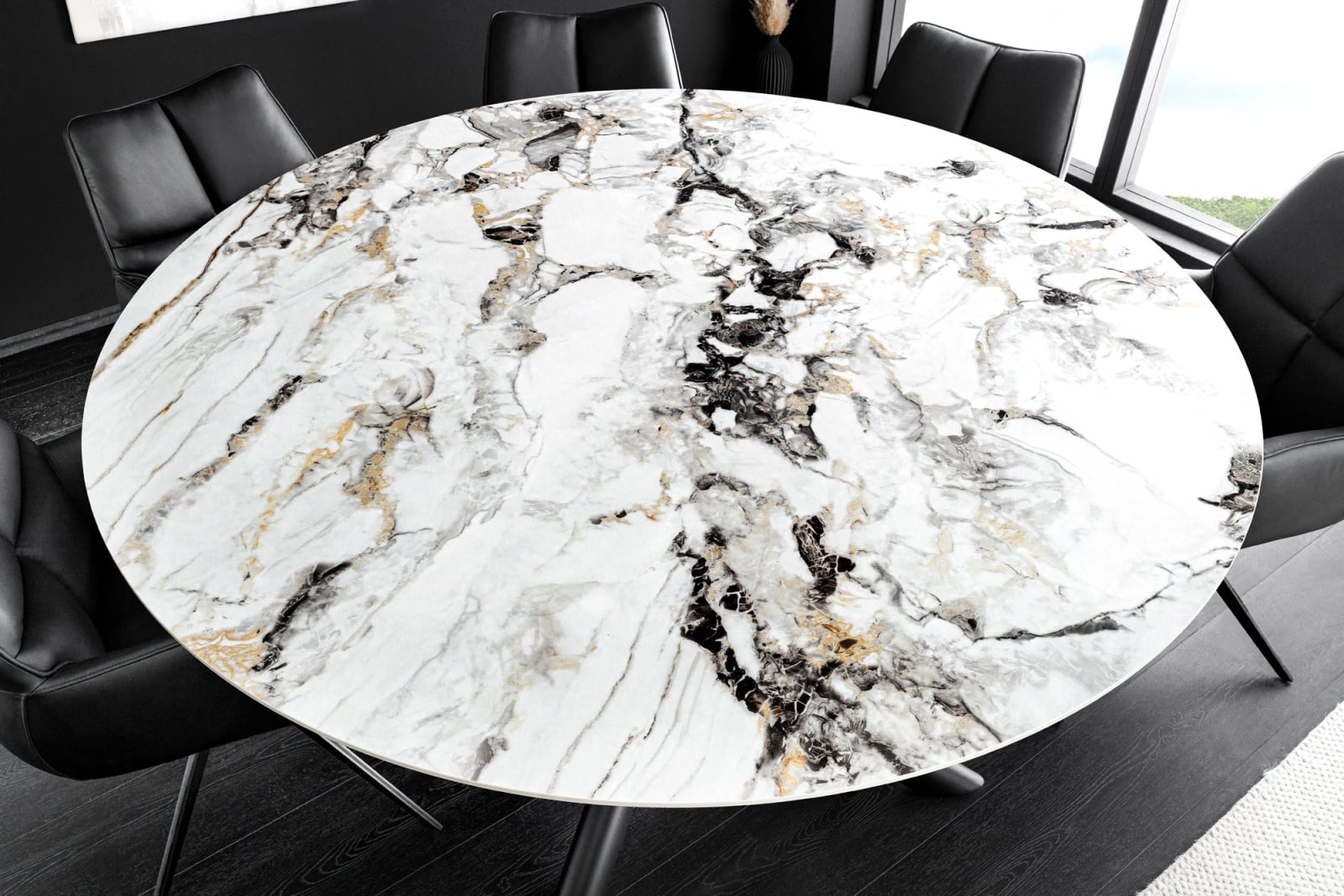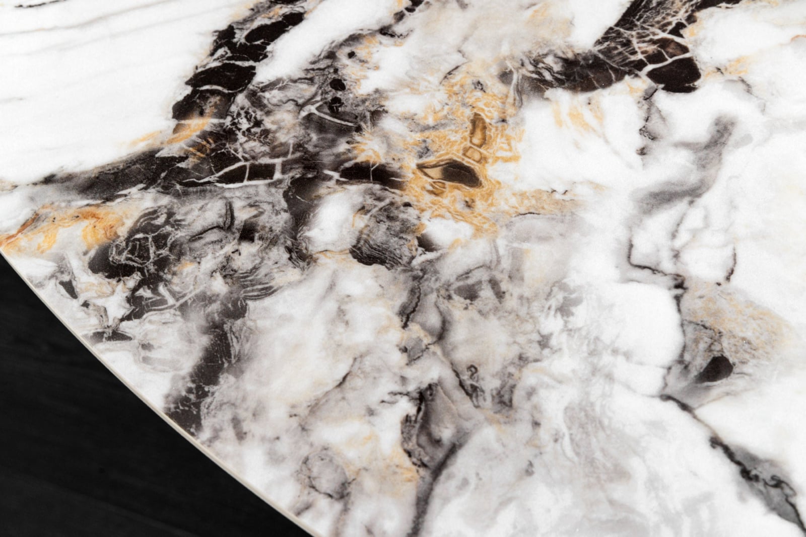 Masa rotundă SPIN combină designul modern cu funcționalitatea practică, devenind piesa centrală elegantă a zonei dvs. de luat masa. Cu un diametru generos de 150 cm, oferă spațiu amplu pentru întâlniri conviviale și mese comune. Blatul elegant, realizat din ceramică Aurora Oro de înaltă calitate, în culoarea pietrei naturale albe, emană rafinament și impresionează prin suprafața sa robustă și ușor de întreținut. Rama robustă din metal negru oferă un contrast izbitor și conferă mesei o notă modernă și sofisticată.