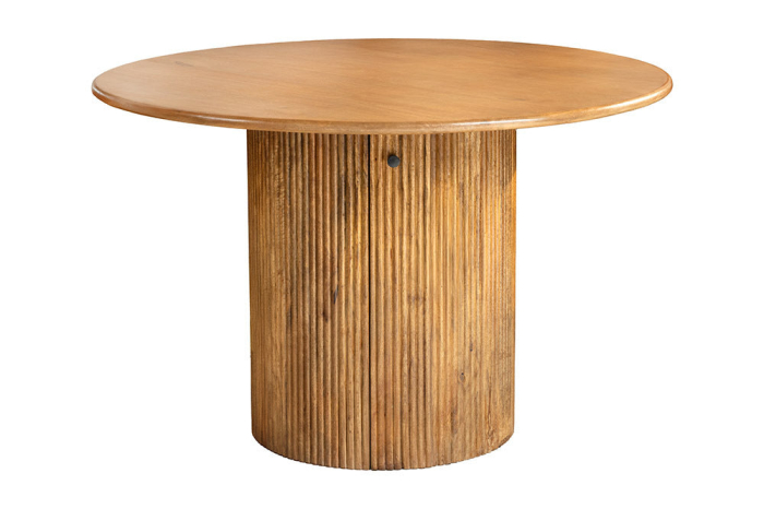 Masa rotundă de sufragerie TRES CHIC impresionează prin combinația reușită de design modern și funcționalitate practică. Fabricată din lemn de salcâm lăcuit maro, aduce o ambianță caldă și elegantă casei tale. Un punct culminant special: cadrul mesei are șipci decorative și o ușă în corp, care ascunde un raft integrat. Aceasta înseamnă că masa nu numai că oferă spațiu amplu pentru mese comune, dar oferă și spațiu de depozitare suplimentar pentru accesorii de masă, vase sau obiecte decorative.